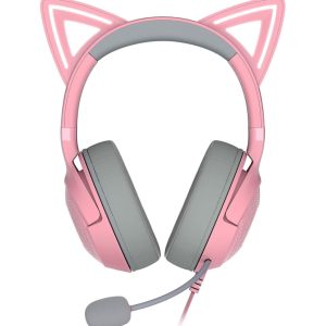 Affirme ton style unique avec le Razer Kraken Kitty V2 Quartz Pink, le casque filaire RGB conçu pour les gamers et streamers qui aiment se démarquer. Ses oreilles de chat iconiques et son éclairage réactif Razer Chroma RGB créent une expérience visuelle dynamique qui interagit avec tes streams. Profite d’un son immersif 7.1 Surround et de haut-parleurs TriForce 40 mm offrant des aigus nets, des médiums équilibrés et des basses puissantes. Le micro cardioïde HyperClear capture ta voix avec clarté tout en réduisant le bruit ambiant. Avec ses coussinets en tissu hybride et similicuir, il assure un confort longue durée pour des sessions intenses et stylées.