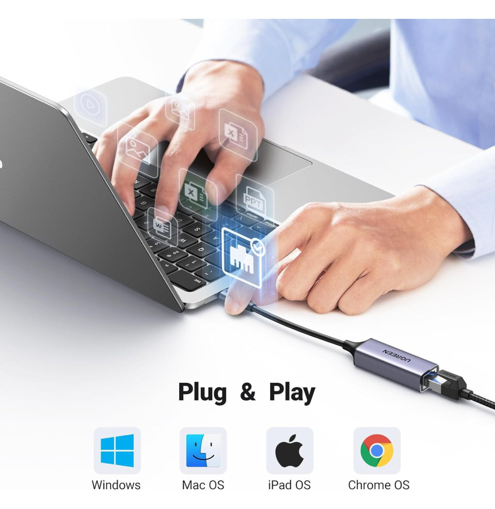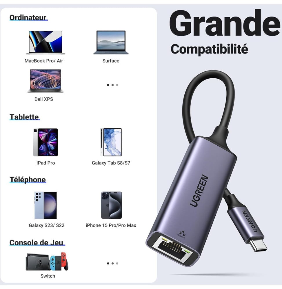 Transformez votre expérience réseau avec l’Adaptateur Ugreen Aluminium USB-C vers RJ45 1000Mbps. Profitez d’une connexion rapide et stable grâce à sa compatibilité avec Windows, MacOS, iOS, Linux et Android. Avec un débit de transfert de 1Gbps et des fonctionnalités avancées telles que l’auto-négociation et la correction automatique de câble, cet adaptateur offre une connectivité sans faille pour améliorer votre productivité.