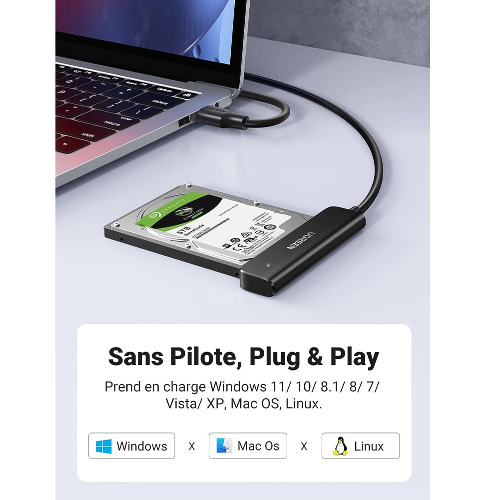 Connectez facilement votre disque dur 2,5″ SATA I/II/III ou SSD à votre ordinateur avec l’adaptateur Ugreen Câble SATA USB 3.0. Profitez de transferts ultrarapides jusqu’à 5 Gbps grâce au protocole UASP. Compatible avec divers systèmes d’exploitation, ce câble compact de 50 cm est prêt à l’emploi partout, sans alimentation externe. L’indicateur LED assure un suivi pratique de l’état de fonctionnement, tandis que la puce intégrée garantit des performances optimales et une sécurité accrue pour vos données. Un must-have pour les utilisateurs de disques durs SATA 2,5″.