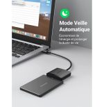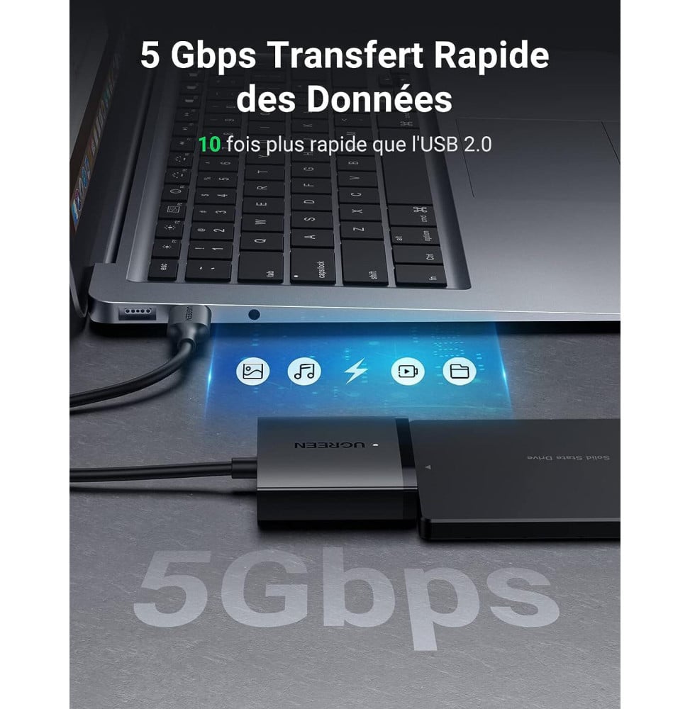 Accédez rapidement à vos données avec l’Adaptateur Ugreen USB SATA III. Connectez sans effort vos disques durs SATA 2,5/3,5 pouces à votre ordinateur pour des transferts de données ultra-rapides jusqu’à 5 Gbps. Ce câble SATA USB plug-and-play est compatible avec Windows et Mac, offrant une sécurité et une durabilité exceptionnelles grâce à la protection contre les surintensités. Suivez votre progression grâce à l’indicateur LED intégré. Profitez de performances supérieures sans effort. Taille compacte de 52,5 x 46 x 13 mm. Longueur de câble de 50 cm. Upgradez sans souci votre stockage.