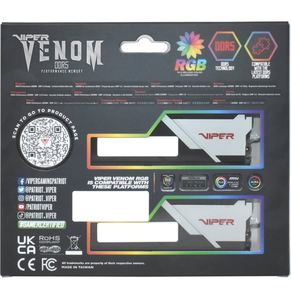 Barrette mémoire Patriot Viper Venom RGB 32GB (16GBx2) U-DIMM DDR5 6000 MHz – Pc Bureau (PVVR532G600C36K)