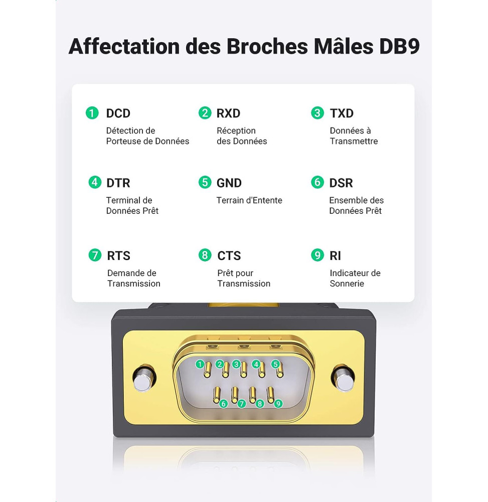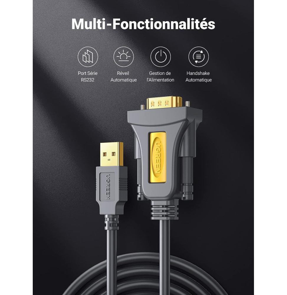 Le Câble Série Ugreen USB 2.0 vers RS232 DB9 Mâle (1.5M) est la solution pour connecter aisément votre PC à une gamme variée d’appareils série, tels que routeurs, modems, caisses enregistreuses, scanners, imprimantes, et bien plus encore. Grâce à son interface RS232/DB9, il assure une communication fiable et rapide. Doté du chipset PL2303, il garantit une transmission stable jusqu’à 480 Mbps, sans besoin de pilotes sous Windows 10/8.1/8. Sa qualité de construction avec blindage multiple et connecteurs plaqués or assure une protection contre les interférences et une durabilité exceptionnelle, résistant à plus de 10 000 branchements. Pour une performance sérieuse dans l’industrie, en supermarché ou au bureau, optez pour ce câble série de qualité.