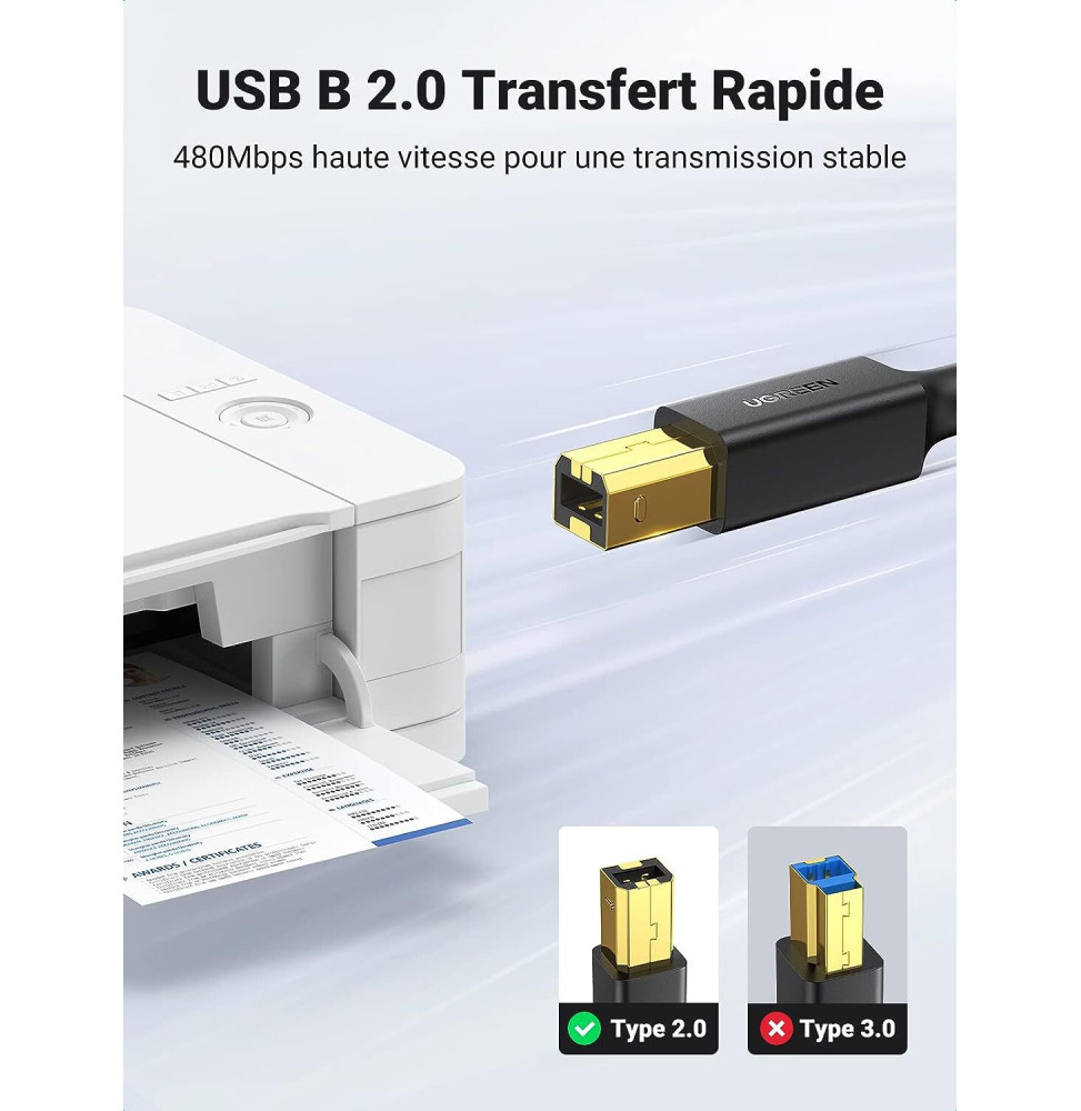 Accédez à une compatibilité étendue avec le Câble Ugreen imprimante USB 2.0 vers USB B Mâle 3M. Connectez aisément votre imprimante, scanner, ou disque dur à votre ordinateur avec une vitesse de transfert jusqu’à 480 Mbps. Profitez d’une transmission stable grâce au triple blindage, éliminant les interférences et épargnant la configuration Wifi. Ce câble durable résiste à 10 000 insertions, offrant une longue durée de vie. Les connecteurs plaqués or 24K assurent une conductibilité parfaite. Un essentiel pour le bureau ou la maison.