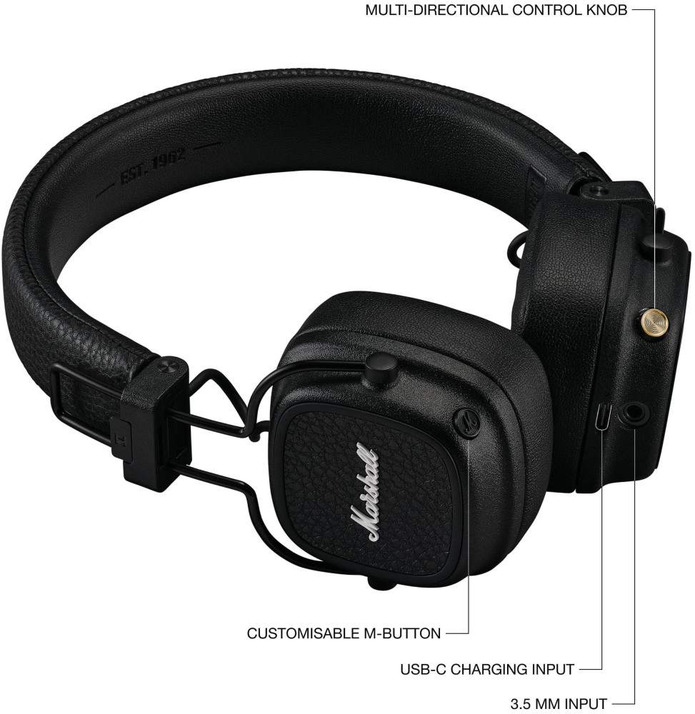 Profitez d’une expérience audio exceptionnelle avec le casque Bluetooth Marshall Major V. Doté de haut-parleurs de 40 mm et de la technologie Bluetooth LE, il offre un son signature Marshall d’une clarté inégalée. Avec plus de 100 heures d’autonomie, il est idéal pour les longues sessions d’écoute. Sa conception pliable et robuste facilite le transport, tandis que l’application dédiée permet de personnaliser les réglages. Rechargez-le sans fil ou via USB-C, et utilisez l’entrée filaire pour prolonger son autonomie.