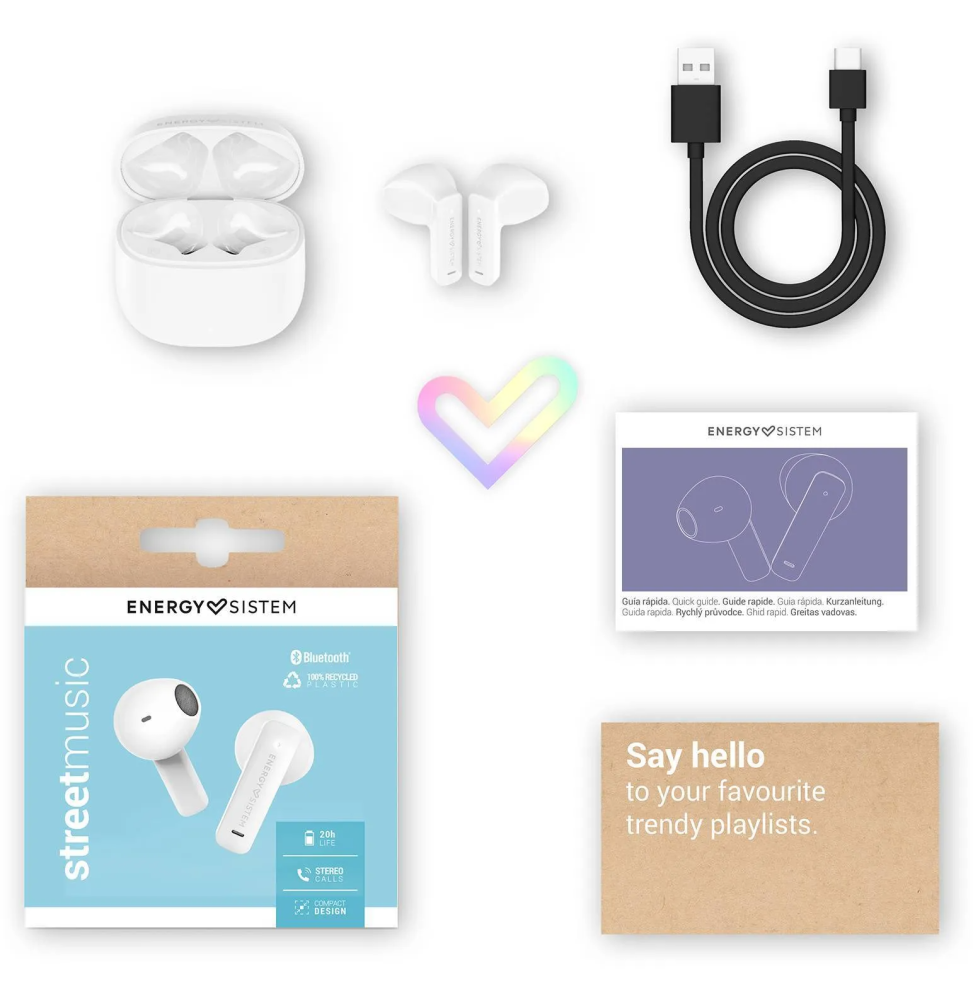 Profitez d’une expérience audio sans compromis avec 1 les écouteurs Bluetooth Energy Sistem StreetMusic – Blanc. Dotés de la technologie True Wireless Stereo et Bluetooth 5.4, ils offrent un son précis avec des graves profonds grâce aux drivers de 13 mm. Avec 20 heures d’autonomie totale, restez connecté à votre musique et appels toute la journée. Leur design compact et confortable, allié à des matériaux recyclés certifiés GRS et FSC, allie performance, style et respect de l’environnement. Un choix intelligent et durable !