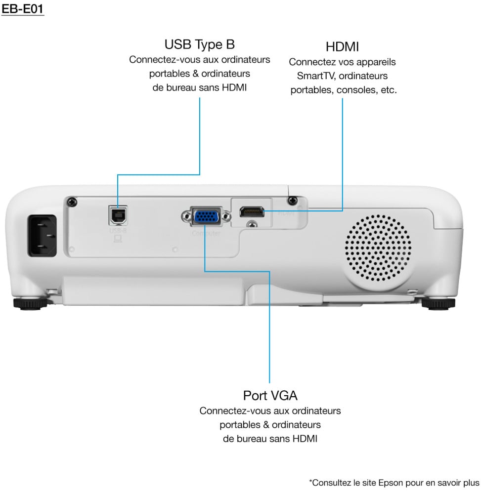 - Entrée VGA, Entrée HDMI, USB 2.0 type B
