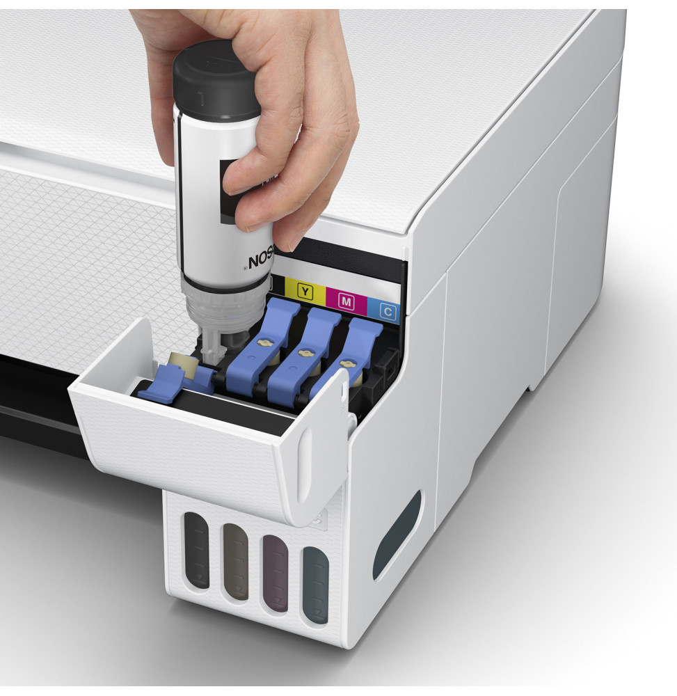 Livrée avec encre noire jusqu'à 7100 pages et 5700 pages en couleur (2 bouteilles d'encre noire de 40ml; 3 Bouteilles d’encre couleurs individuelles de 40ml)