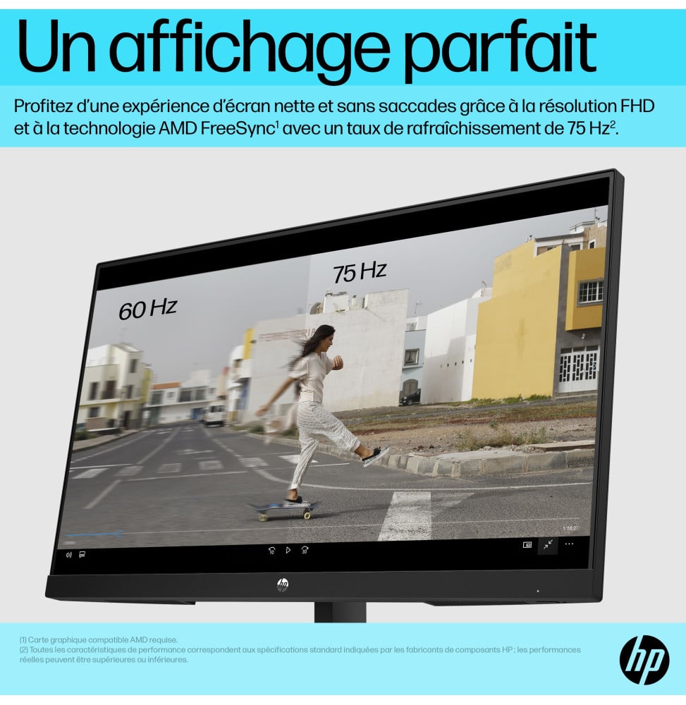 Productivité quotidienne: Voyez plus loin avec l’écran HP FHD V24v G5. Alliez efficacité et esthétique grâce à un affichage superbe en Full HD avec technologie anti-saccades AMD FreeSync™. Bénéficiez d’un cadre élégant à micro-bords sur 3 côtés, d’une gestion ordonnée des câbles et d’un socle ultra-plat pour un bureau épuré. Personnalisez facilement vos réglages grâce au bouton Joypad OSD ou au HP Display Center. Avec un taux de rafraîchissement de 75 Hz, cet écran offre des images nettes et fluides pour une productivité maximale.