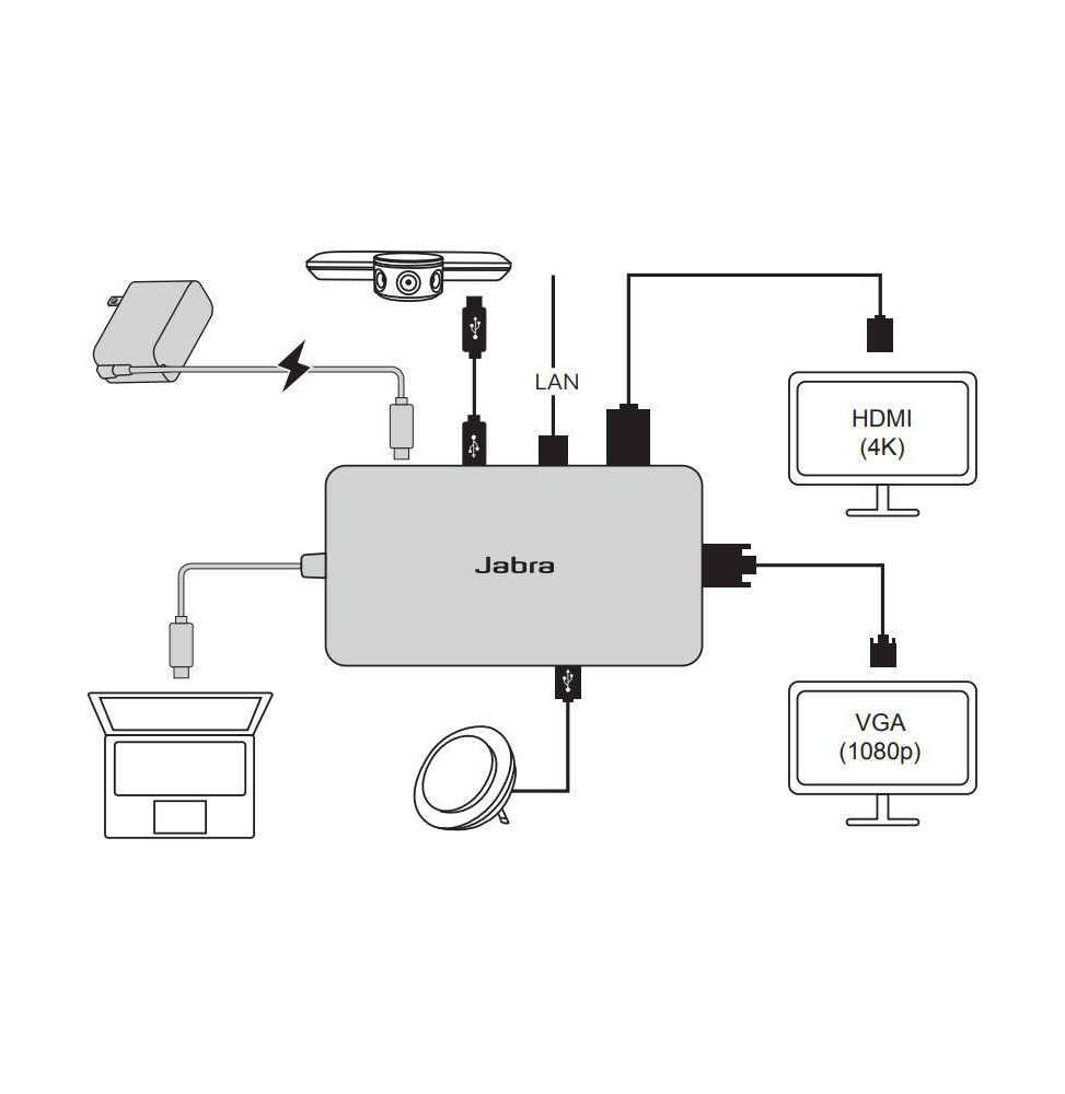 Simplifiez vos réunions avec le Hub USB Jabra PanaCast USB-C. Conçu pour connecter facilement votre Jabra PanaCast et Jabra Speak à votre ordinateur, ce hub central compact offre une interface USB 3.2 Gen 1 Type-C pour une connectivité rapide et fiable. Avec des ports Ethernet, HDMI et USB, ce hub central élimine les câbles encombrants et optimise l’organisation de votre espace de travail. Profitez d’une installation fluide pour des visioconférences de haute qualité et une collaboration sans interruption.