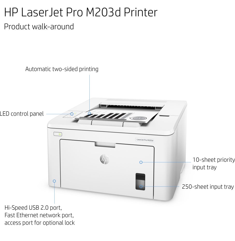 - Imprimante HP LaserJet Pro M203dn Cartouche de démarrage à toner LaserJet noir HP (environ 1 000 pages) Tambour d’imagerie HP LaserJet (23 000 pages) HIG, Poster d’installation, Brochure d’assistance, Guide de garantie, Dépliant, Documentation et logiciels de l’imprimante sur CD-ROM, Documentation et pilotes logiciels sur CD-ROM, CD contenant le logiciel et la documentation électronique Cordon d’alimentation