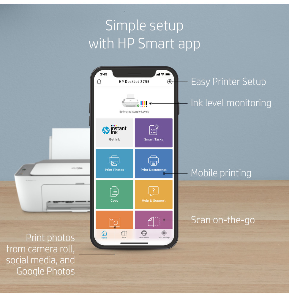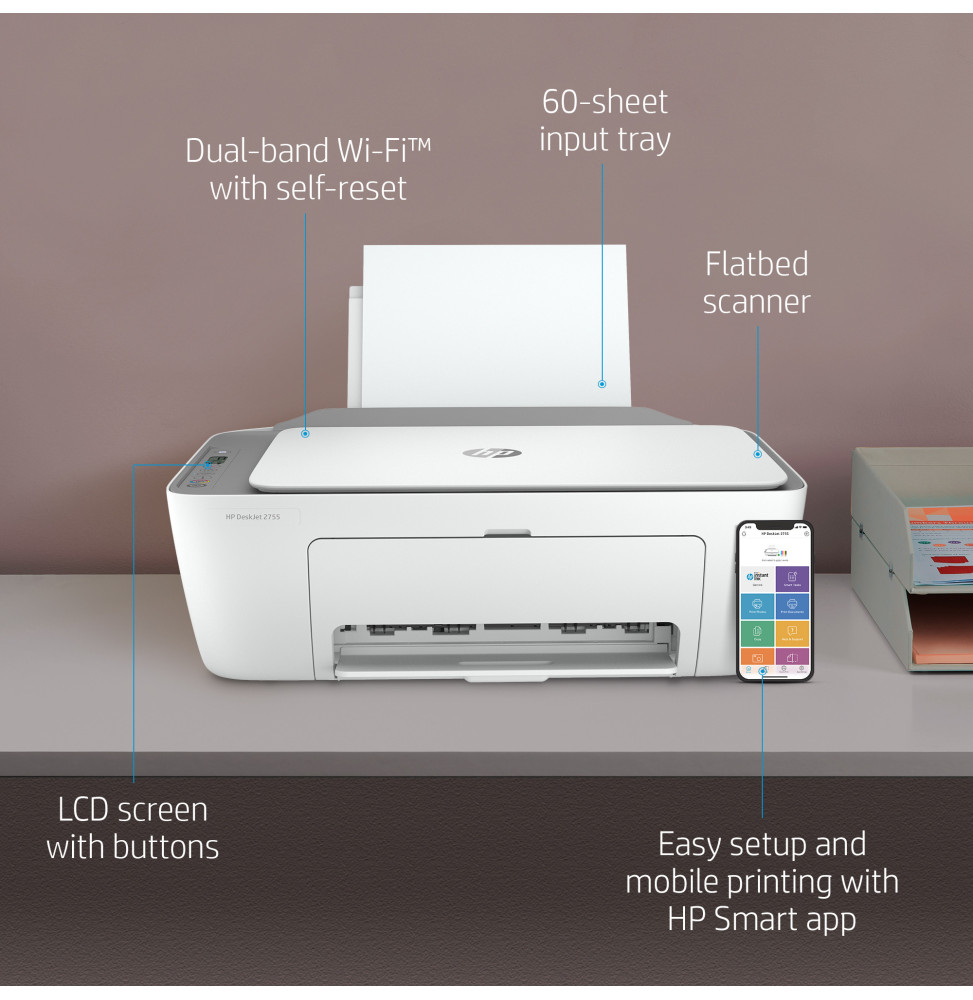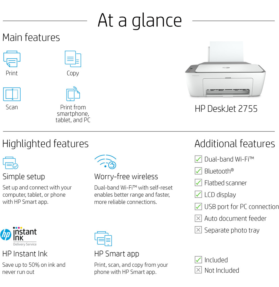 - Imprimante tout-en-un HP DeskJet 2710 Cartouche de démarrage HP 305, noire Cartouche de démarrage HP 305, trois couleurs Brochure sur les réglementations Guide d’installation Guide de référence Cordon d’alimentation.