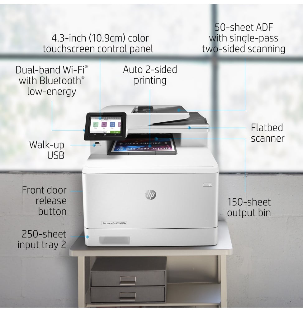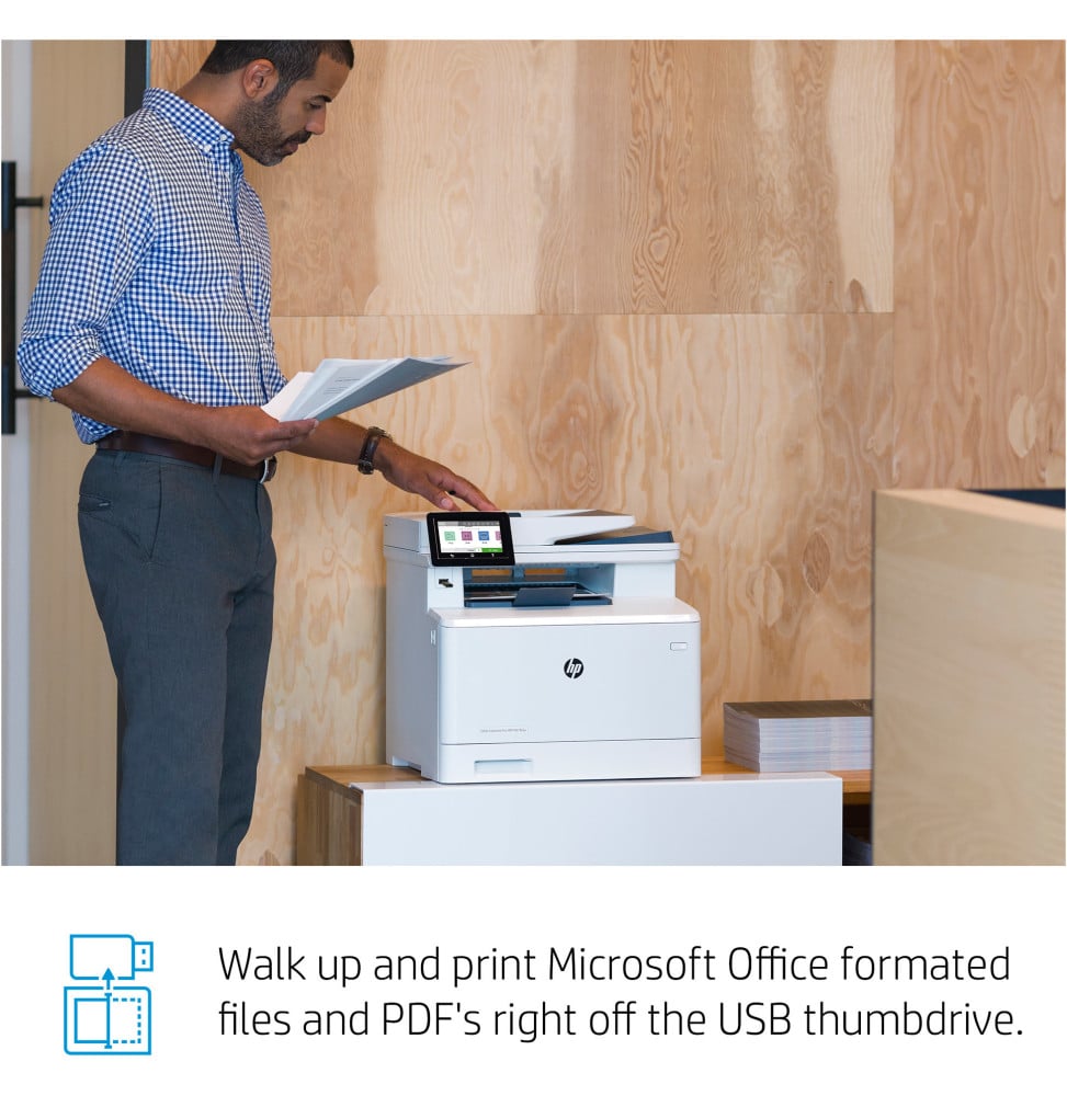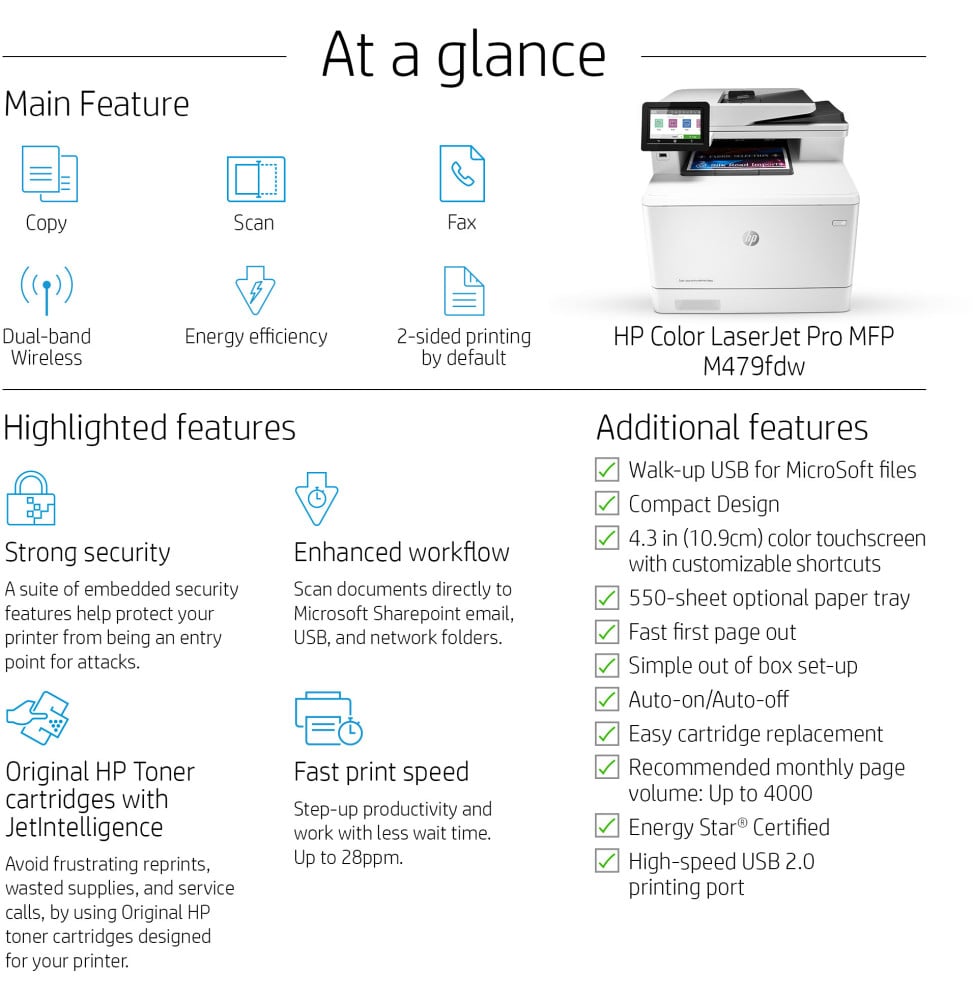 - HP Color LaserJet Pro M479fnw 4 cartouches de toner HP LaserJet pré-installées (noir : 2 400 pages, démarrage cyan, magenta et jaune : 1 200 pages) Documentation fournie (Guide de mise en route, Poster d’installation) Carte de garantie (le cas échéant) Une connexion Internet est requise pour la configuration de l’imprimante Cordon d’alimentation Câble USB Câble de télécopieur