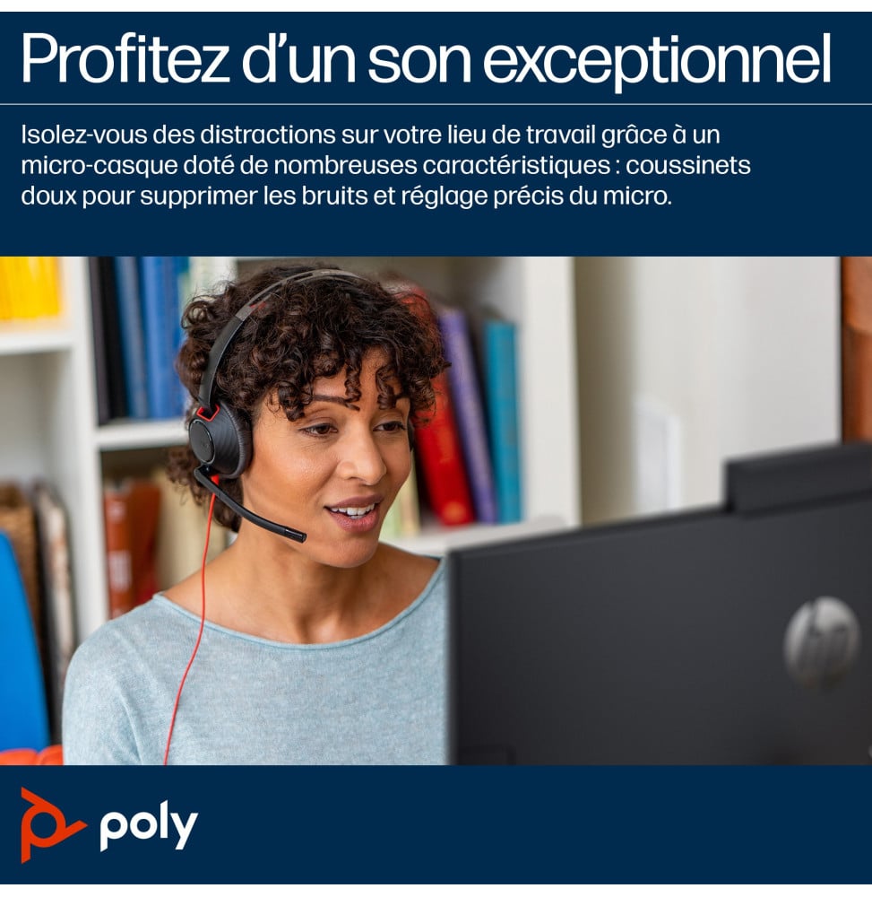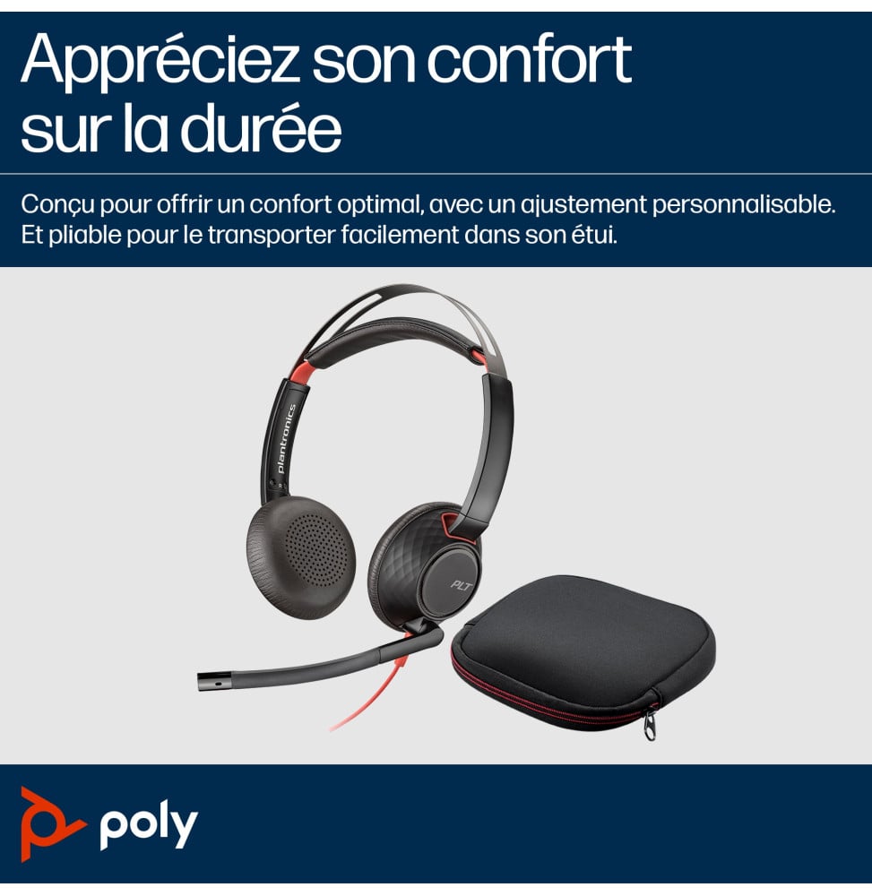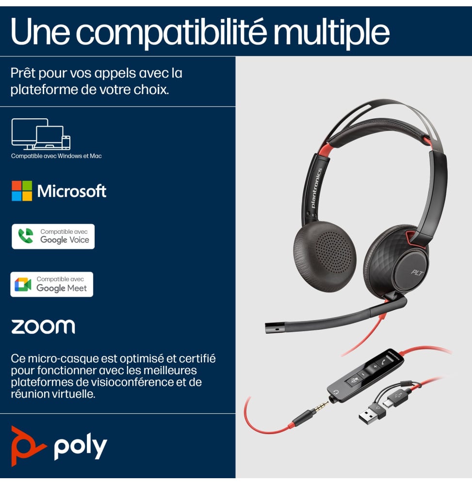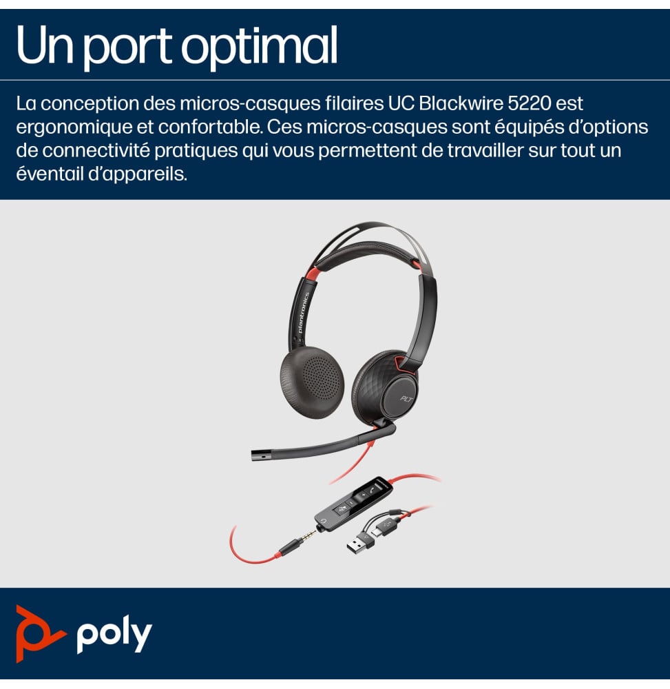 Améliorez votre productivité avec le micro-casque POLY Blackwire 5220. Conçu pour un confort prolongé, ses coussinets doux et son arceau réglable réduisent le bruit de fond pour une concentration maximale. Avec une connectivité USB-C, 3,5 mm et adaptateur USB-C/A, il s’adapte à tous vos appareils. Son microphone à suppression de bruit assure des conversations claires. Idéal pour les environnements de travail dynamiques, ce casque filaire offre une solution audio exceptionnelle, certifiée pour Microsoft Teams et Zoom.