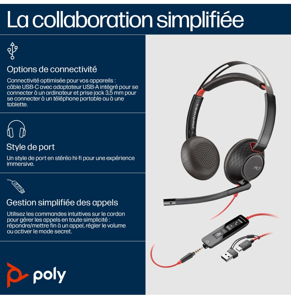 Micro-casque POLY Blackwire 5220 stéréo USB-C + connexion 3,5 mm + adaptateur USB-C/A (8X231AA)