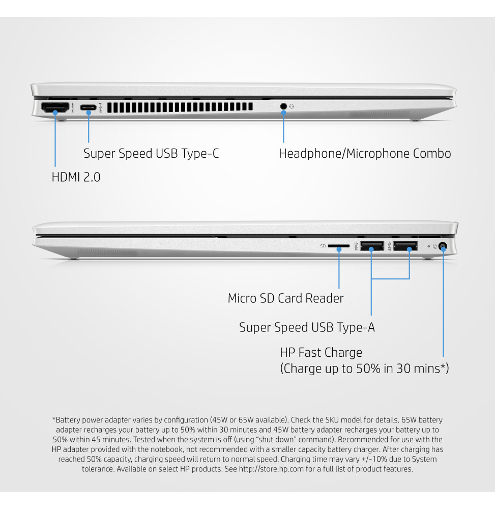 1 port USB Type-C®, vitesse de transfert de 10 Gbit/s (alimentation USB, DisplayPort™ 1,4, HP Veille et Charge); 2 ports USB Type-A, vitesse de transfert de 5 Gbit/s; 1 prise adaptateur secteur Smart Pin; 1 port HDMI 2.1 ; 1 prise combinée casque/microphone