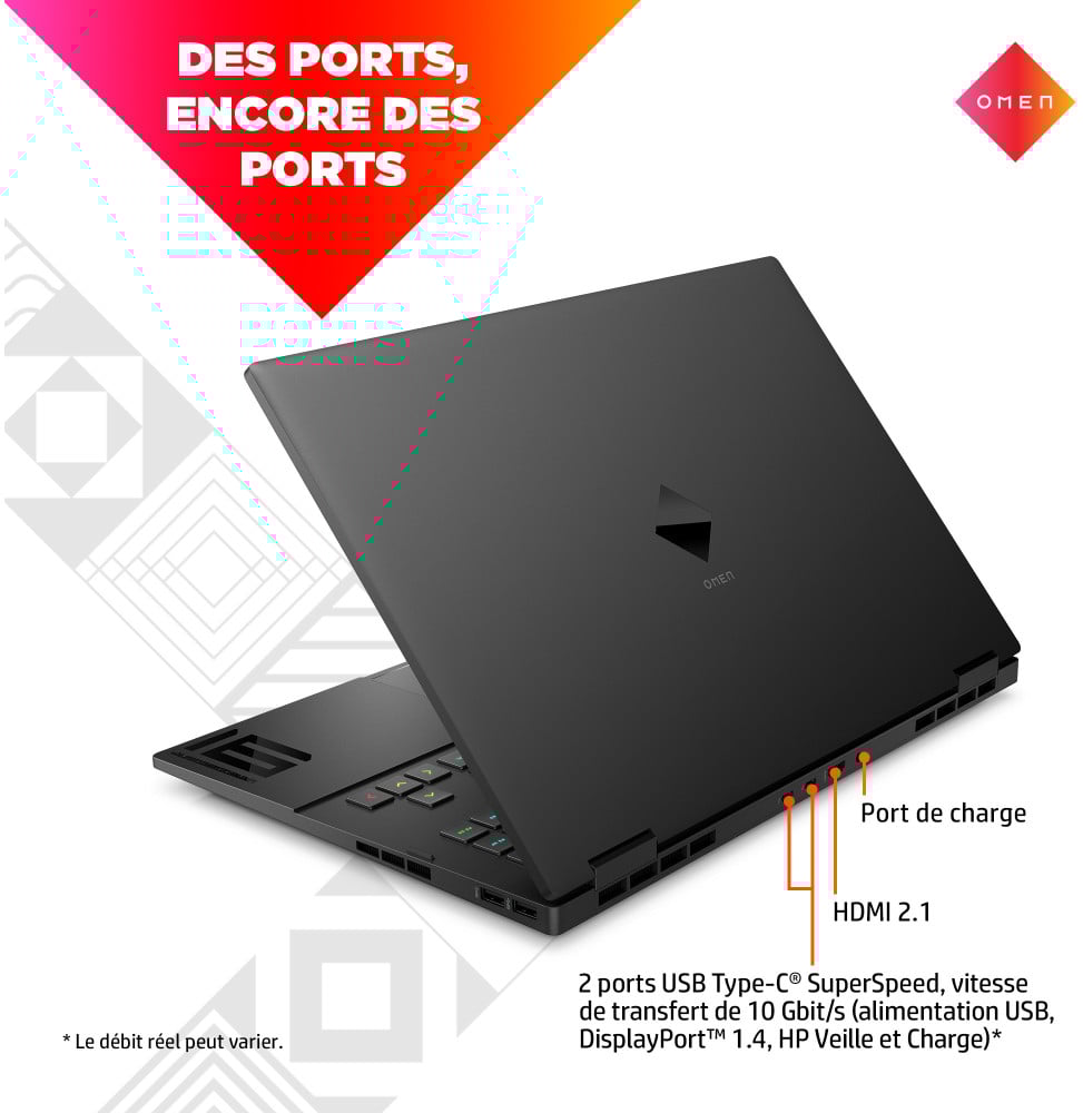2 ports Thunderbolt™ 4 avec USB4™ Type-C®, vitesse de transfert 40 Gbit/s (alimentation USB, DisplayPort™ 1.4, HP Veille et Charge) ; 1 port USB Type-A SuperSpeed, vitesse de transfert de 5 Gbit/s (HP Veille et Charge) ; 2 ports USB Type-A SuperSpeed, vitesse de transfert de 5 Gbit/s ; 1 port HDMI 2.1 ; 1 port RJ-45 ; 1 prise Smart Pin CA ; 1 prise combinée casque/microphone
