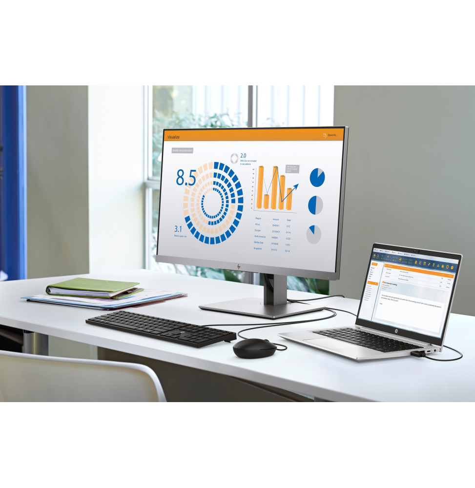 2 ports USB Type-A SuperSpeed, vitesse de transfert de 5 Gbit/s (1 port de charge et 1 port d’alimentation); 1 port USB Type-C® SuperSpeed, vitesse de transfert de 10 Gbit/s (alimentation par USB, DisplayPort™ 1.4); 1 prise combinée casque/microphone; 1 port HDMI 1.4b; 1 alimentation secteur