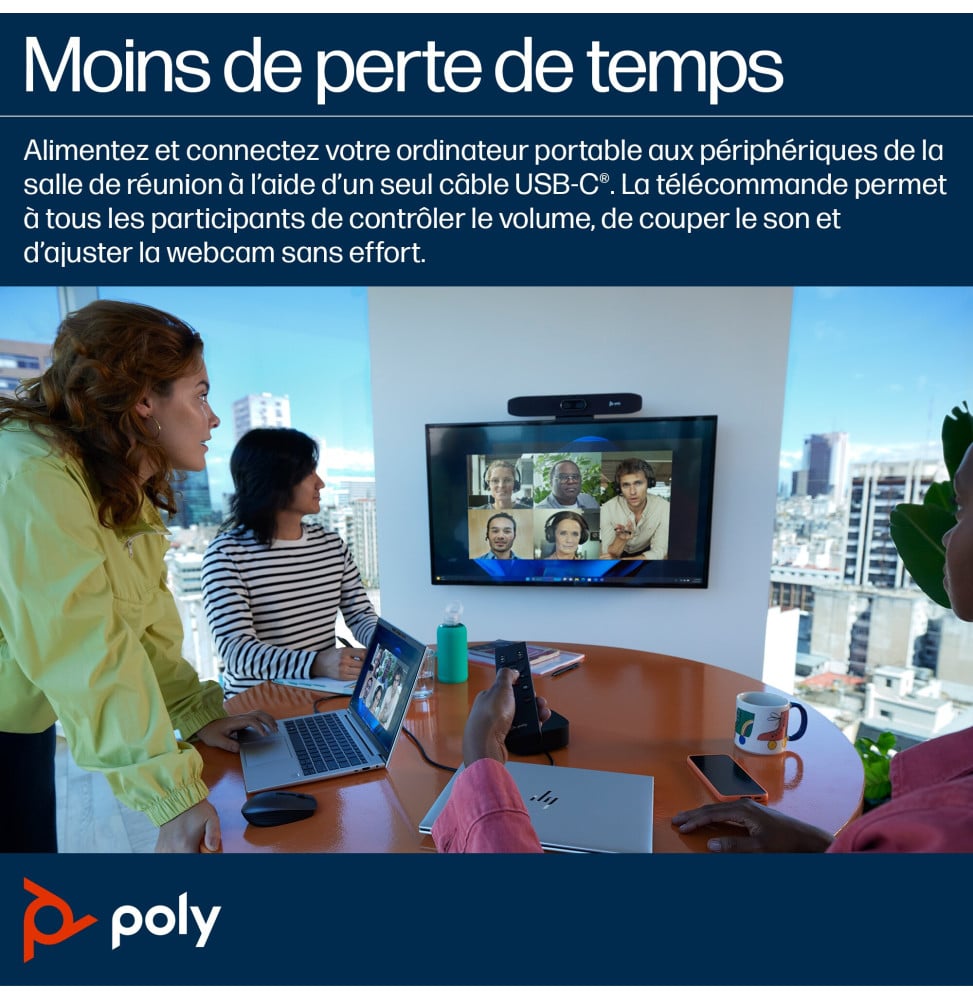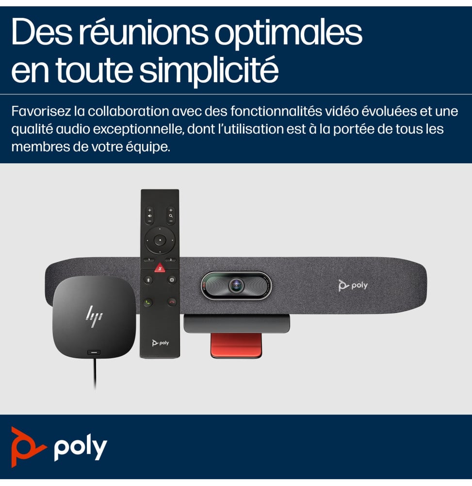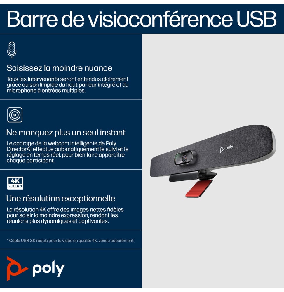Transformez vos réunions avec la Barre de visioconférence USB Studio R30 Poly. Vivez une collaboration immersive avec une qualité vidéo 4K Ultra HD et un angle de vue de 120°. Son audio cristallin élimine intelligemment les bruits de fond, assurant une clarté vocale inégalée. Configuration rapide et intuitive, garantissant une mise en place sans tracas. Grâce à la technologie Poly DirectorAI, le cadrage reste toujours précis. Réduisez les distractions avec Poly NoiseBlock AI et Acoustic Fence. Compatibilité USB universelle pour une intégration facile. En option, une télécommande Bluetooth® simplifie le contrôle.