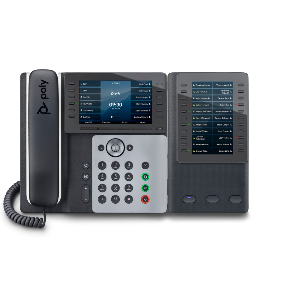 – Ce téléphone robuste est équipé d’un grand écran couleur de 5 pouces et est conçu pour gérer jusqu’à 48 lignes. De plus, la gamme Poly Edge E500 peut recevoir deux modules d’extension supplémentaires permettant de prendre en charge jusqu’à 66 contacts additionnels chacun.