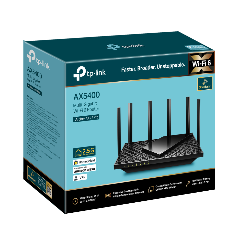 Accédez à une vitesse WiFi ultra-rapide et stable avec le routeur TP-Link Archer AX72 Pro. Grâce à la technologie WiFi 6 et au port 2.5G, bénéficiez d’un débit allant jusqu’à 5400 Mbps, idéal pour le streaming 8K, les jeux en ligne et le téléchargement simultané. Sa couverture étendue avec 6 antennes et le beamforming garantit une connexion fiable dans toute la maison. Gérez plus de 100 appareils sans ralentissement avec MU-MIMO et OFDMA. Profitez aussi de la sécurité avancée HomeShield, du partage USB 3.0, du VPN intégré et d’une configuration rapide via l’application Tether.