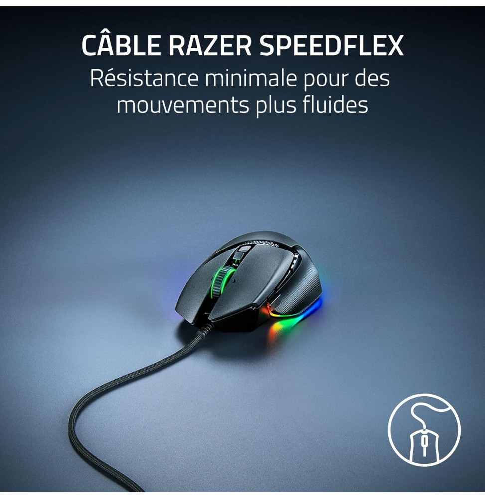 Prenez l’avantage à chaque partie avec la Razer Basilisk V3 35K, une souris gaming filaire conçue pour les joueurs exigeants. Son capteur optique Focus Pro 35K Gen-2 assure une précision extrême, même sur le verre, pour un contrôle millimétré. Les 13 commandes personnalisables et la molette Razer HyperScroll Tilt Wheel offrent une flexibilité totale pour adapter chaque action à votre style de jeu. Profitez d’un éclairage Chroma RGB à 11 zones pour une immersion visuelle unique, et de switches optiques Gen-3 ultra-réactifs garantissant 90 millions de clics fiables. Avec son câble Speedflex, bénéficiez d’une glisse fluide et sans résistance pour des performances dignes des pros.