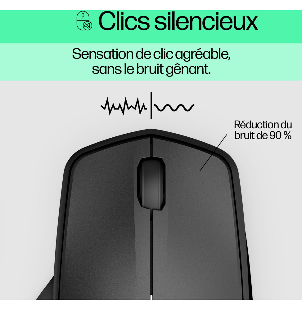 Travaillez en toute sérénité avec la souris sans fil silencieuse HP 280, conçue pour allier confort, précision et tranquillité. Son design ergonomique assure une prise en main naturelle, idéale pour une utilisation prolongée sans fatigue. Grâce à la technologie HP Blue Optical, profitez d’une précision fluide sur toutes les surfaces, où que vous soyez. Son clic silencieux réduit le bruit de 90 %, pour une productivité optimale dans les environnements calmes. La connexion sans fil 2,4 GHz garantit une réactivité instantanée, et le récepteur USB se range facilement dans la souris pour vos déplacements. HP 280, l’efficacité silencieuse au quotidien.