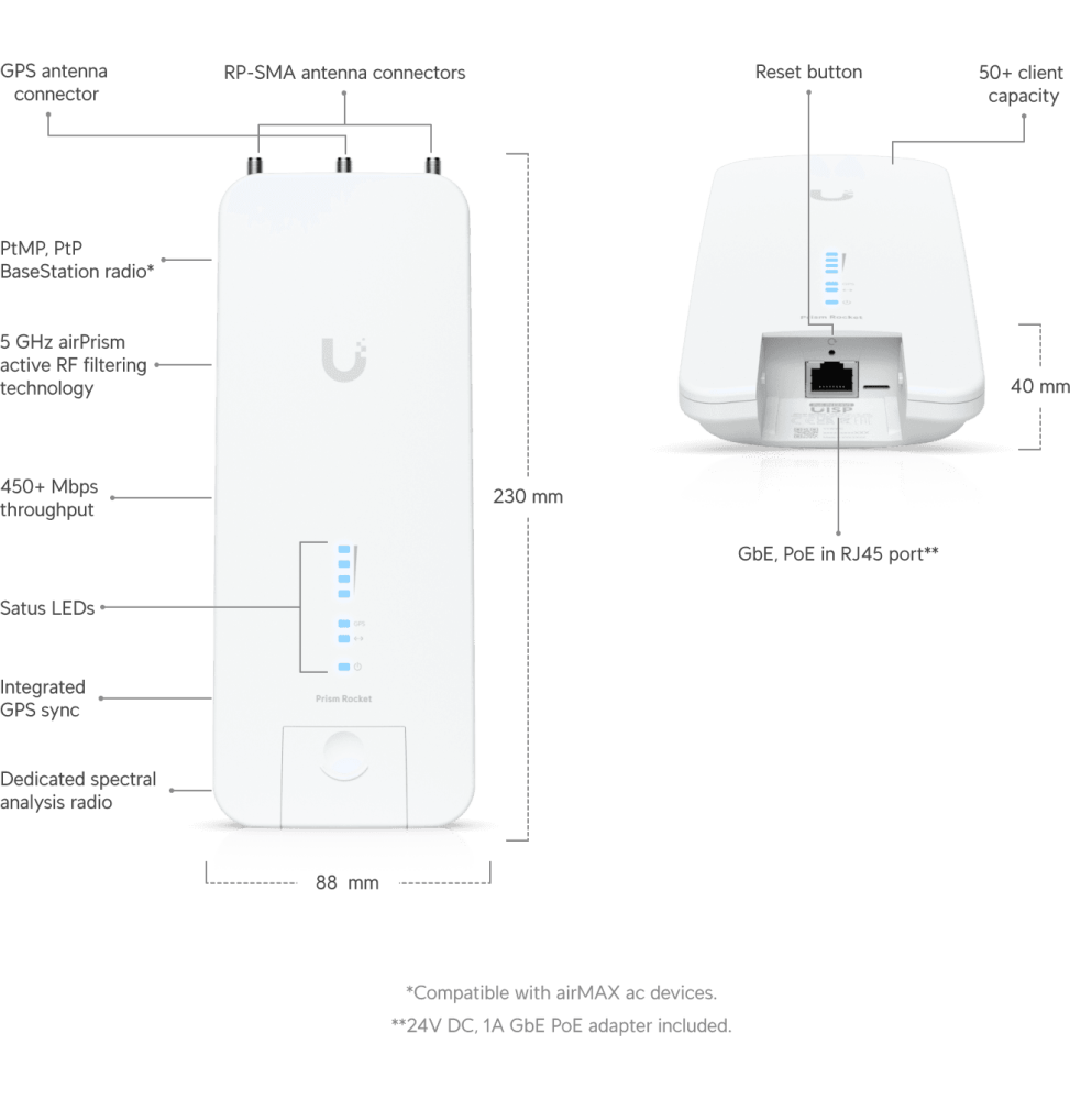 Optimisez vos connexions sans fil avec la RocketPRISM 5AC Gen2, une station de base 5 GHz hautes performances idéale pour les liaisons Point-à-Multipoint (PtMP) et Point-à-Point (PtP). Capable d’un débit supérieur à 500 Mbps, elle garantit une transmission rapide 1 et fiable. Son boîtier en aluminium moulé assure une durabilité exceptionnelle, même en conditions extrêmes. Grâce à la technologie airMAX ac, à la gestion avancée QoS et aux outils intégrés (airView, speed test, alignement d’antenne), elle offre une expérience réseau maîtrisée. Alimentée en PoE et dotée d’une interface gigabit, elle se distingue par sa flexibilité, sa sécurité WPA2 AES, et ses performances optimisées.