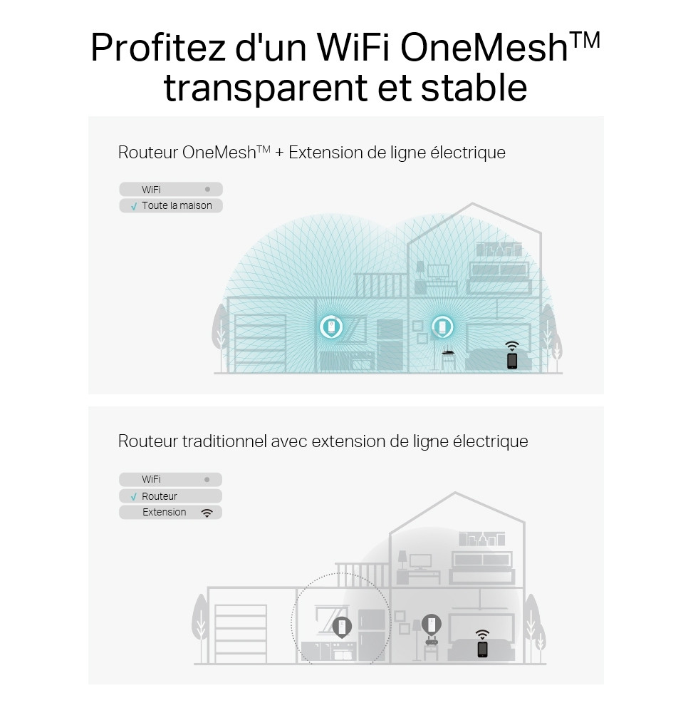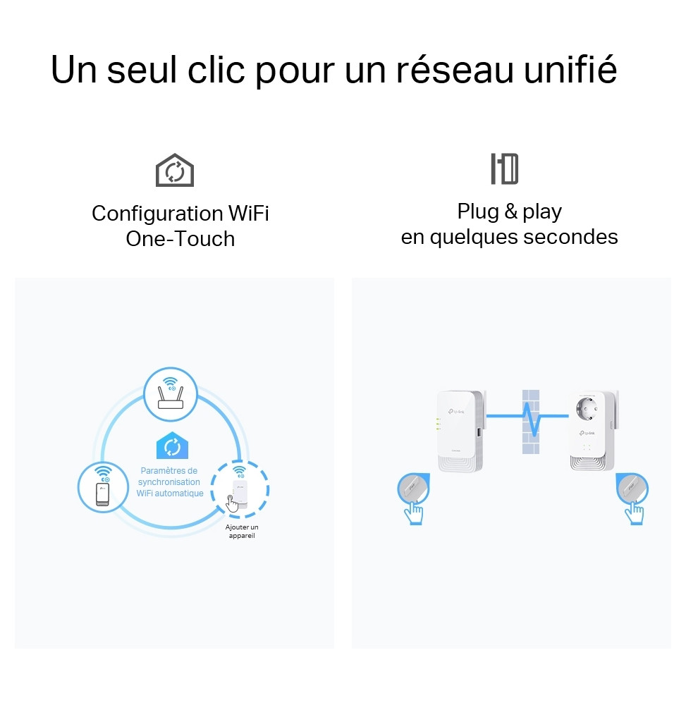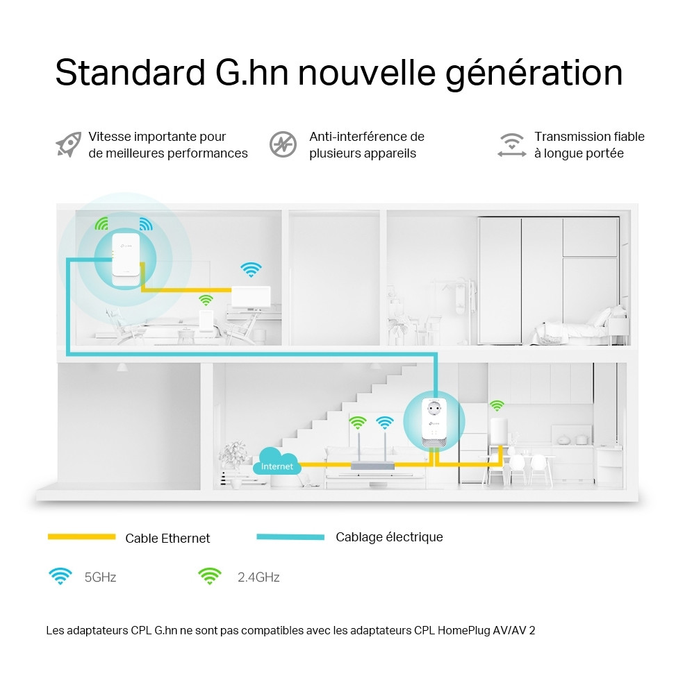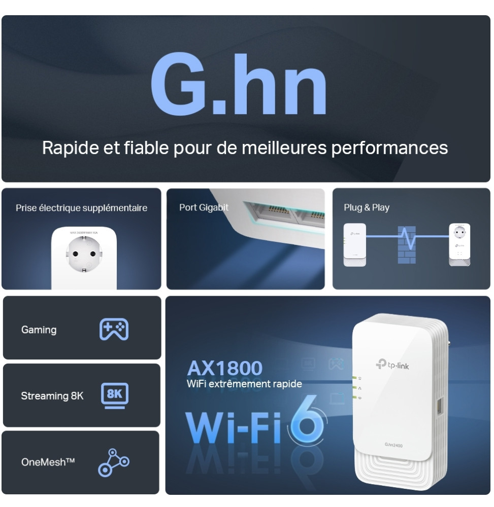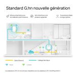 Profitez d’une connexion ultra-stable avec le kit CPL TP-Link PGW2445, conçu pour booster votre réseau domestique grâce à la technologie avancée G.hn MIMO. Ce kit WiFi 6 AX1800 offre jusqu’à 2400 Mbps via le courant électrique, avec un WiFi dual-band à 1201 Mbps (5 GHz) + 574 Mbps (2,4 GHz), idéal pour le streaming 8K et le gaming sans latence. Grâce à OneMesh™, bénéficiez d’un WiFi fluide dans toute la maison, sans coupure. Les 2+1 ports Gigabit garantissent des connexions filaires rapides, et la prise intégrée évite toute perte de courant. Installation simple, performance maximale.