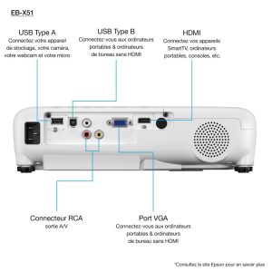 Connexions: USB 2.0 type A, USB 2.0 type B, Entrée VGA, Entrée HDMI, Entrée composite, Entrée RCA, Réseau local sans fil IEEE 802.11b/g/n (WiFi 4) (en option)